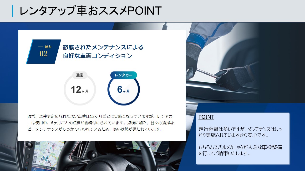 レンタカーは様々な方が使用する車。日常整備も6か月ごとに実施されています。