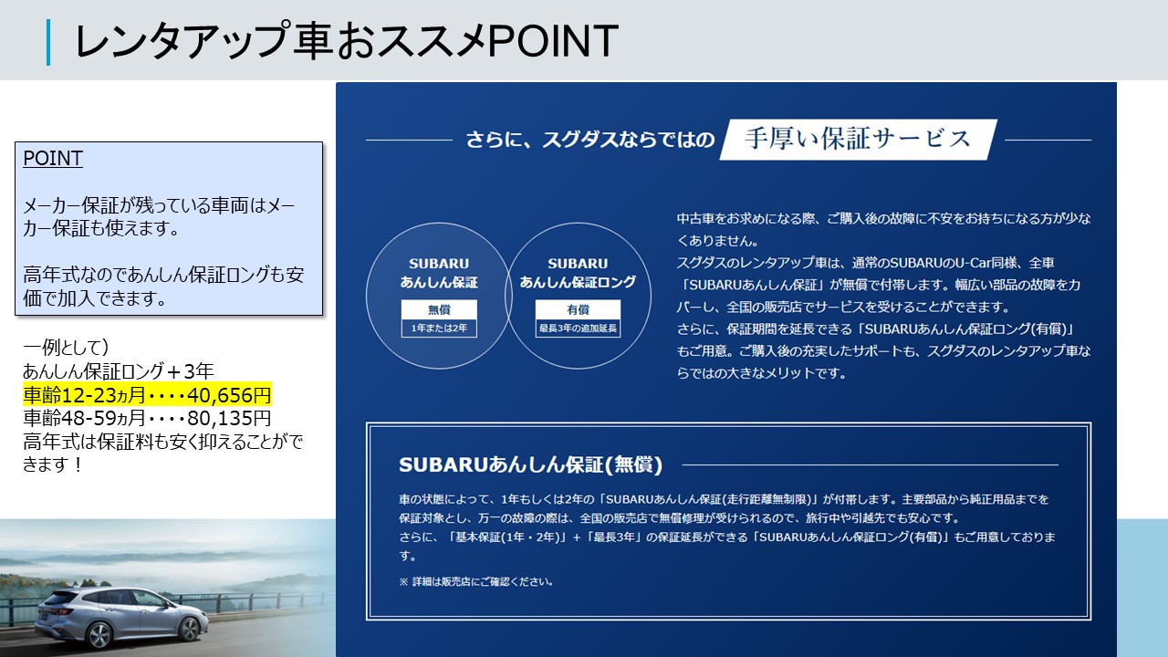 高年式が多いためスバル中古車保証延長制度、「あんしん保証ロング」も安価で加入できます!!ナルホドオトク