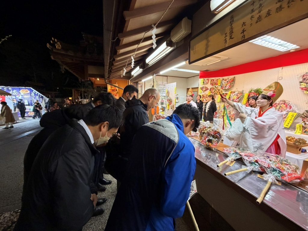 昨年の笹を返納し、今年は熊手を購入しました。巫女さんにしっかり幸運を授かって