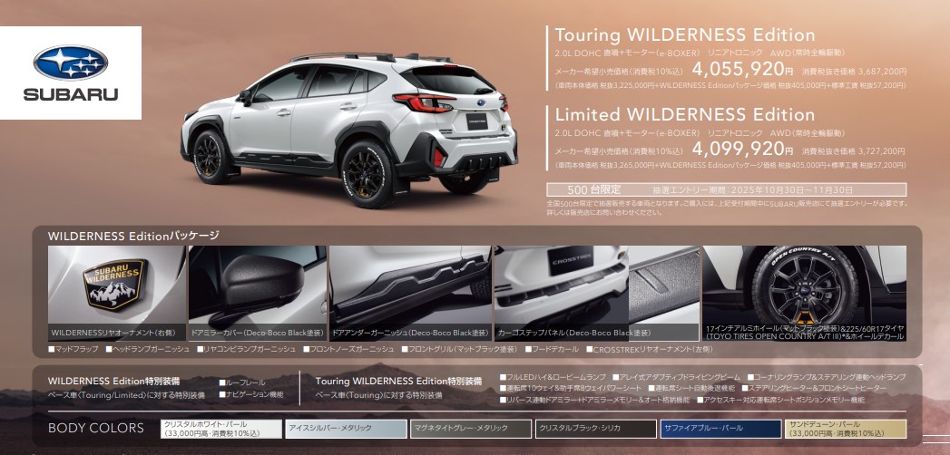 クロストレックで展開されている用品やWILDERNESS専用の用品が設定されており、日本で500台の限定デザインとなっています![]()