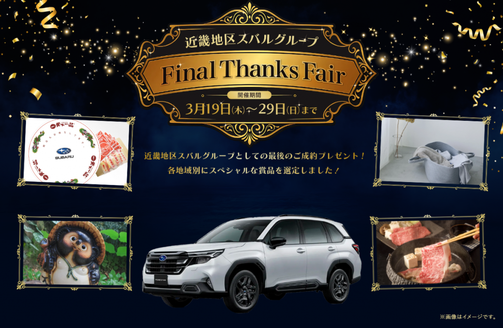 近畿地区スバルグループの最後のご成約プレゼントとして、各地域別にスペシャルな賞品を選定しました☆