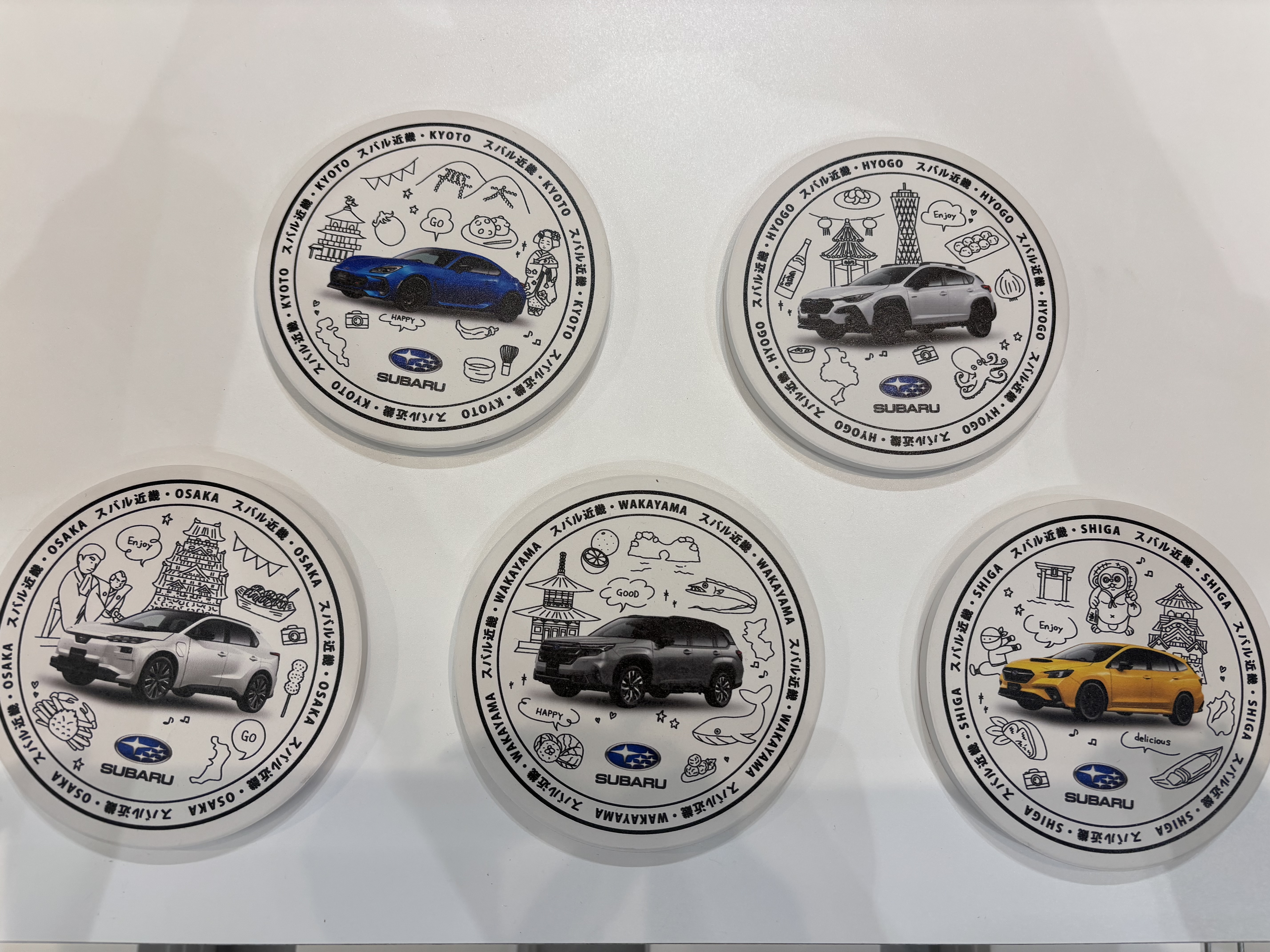 各地の名所とスバル車が描かれたコースターです![]()