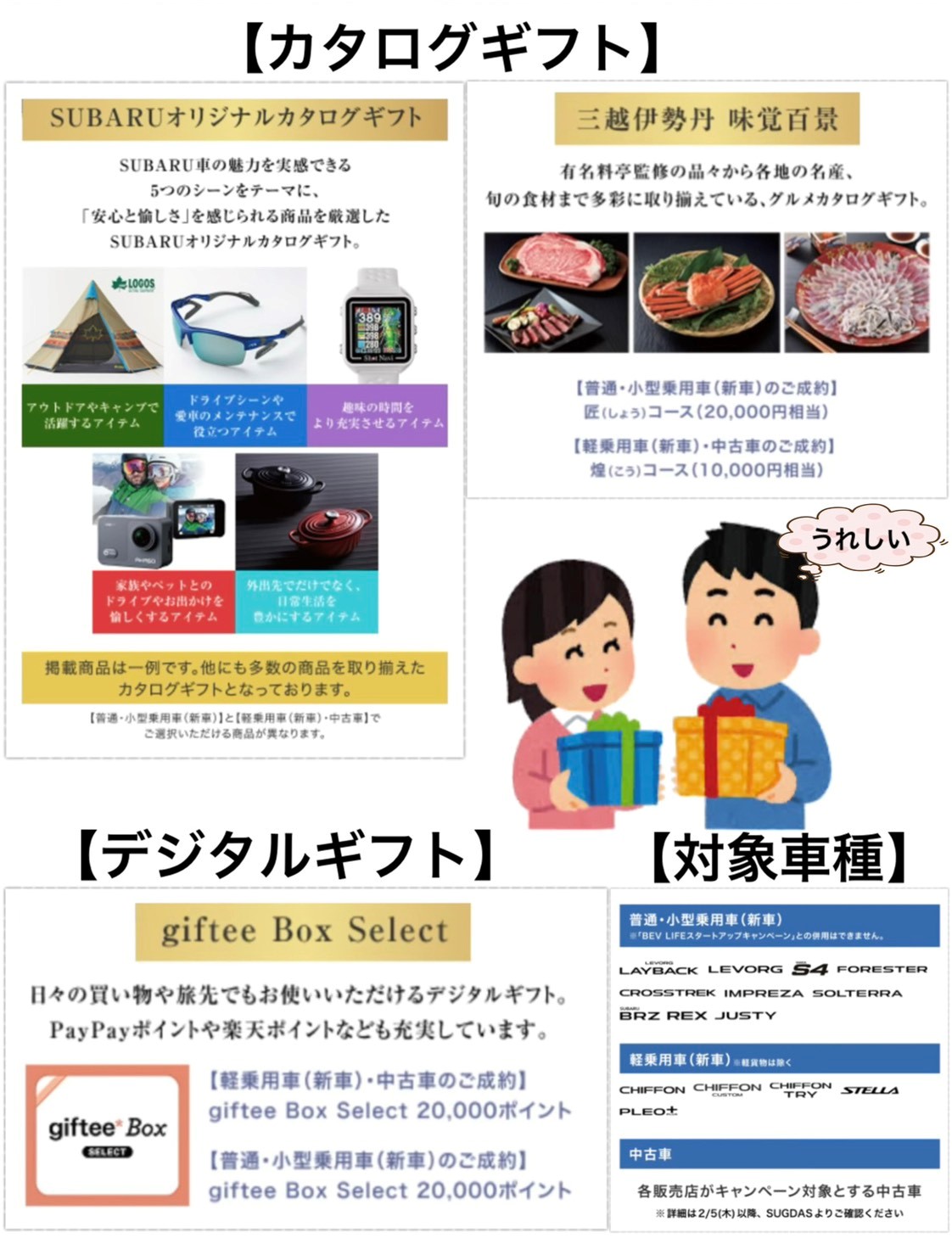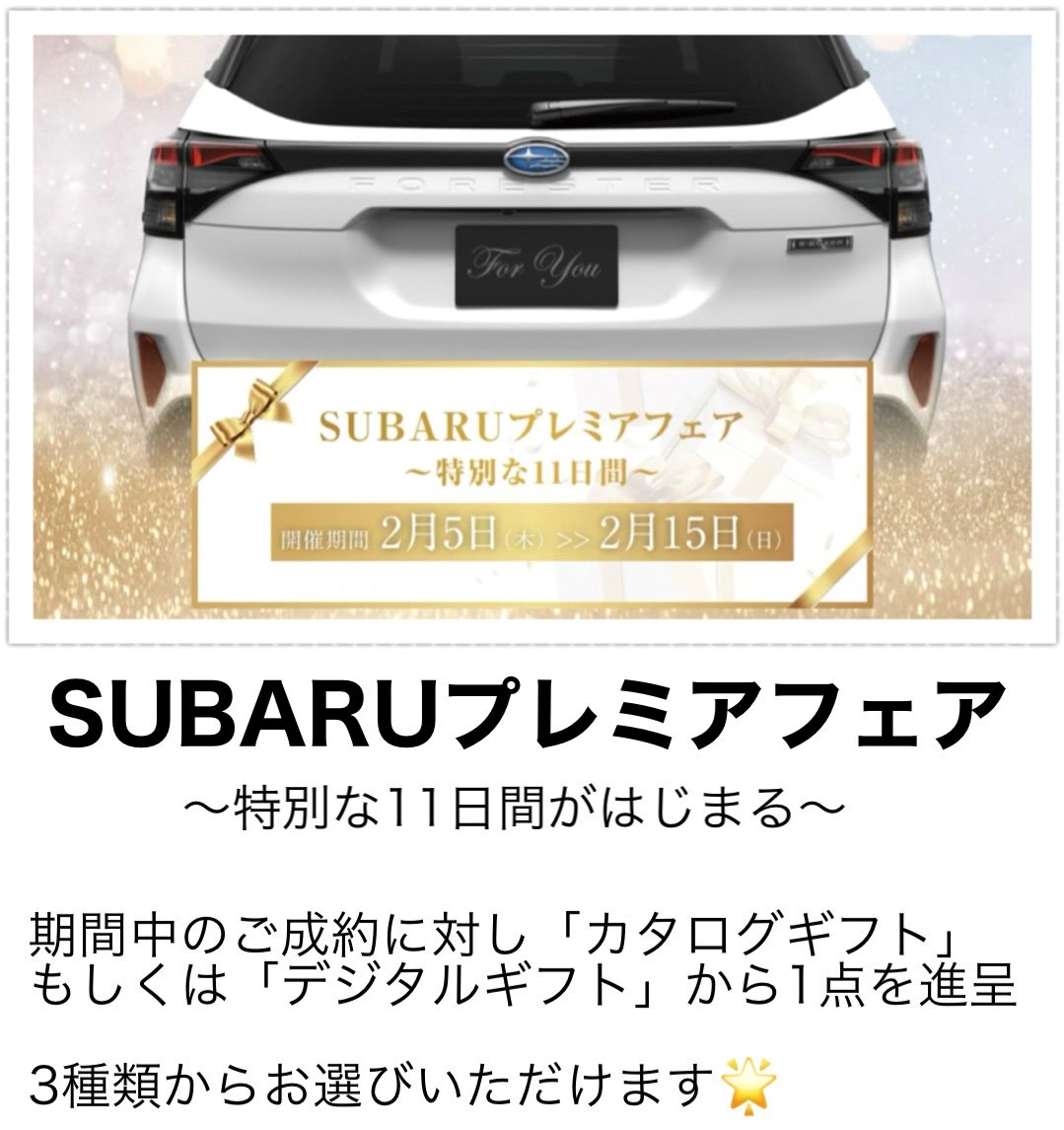 ※画像はイメージです。※ご成約1台につき賞品は1点限りとなります。※以前のご成約にさかのぼって適用することはできません。※ご成約後にキャンセルされた場合は、本キャンペーンの適用はできません。※他のキャンペーンとの併用はできません。※株式会社SUBARU販売店関係者は適用対象外です。※本権利は譲渡及び金銭や他の物品と交換は出来ません。※詳しくは店頭スタッフにお問い合わせください。