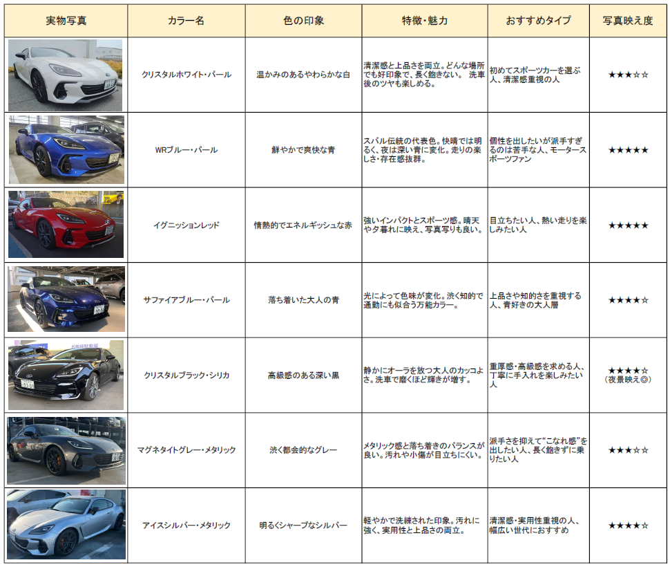 《BRZカラー別 おすすめ POINT》※↓タップするとおおきくなります