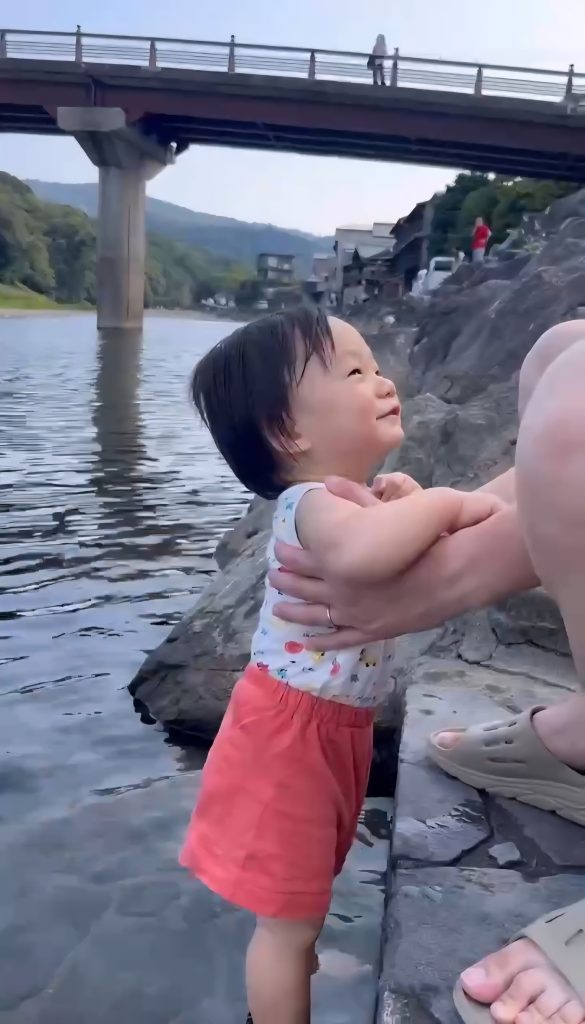 最後は裏の河川敷で足をちゃぷん![]()