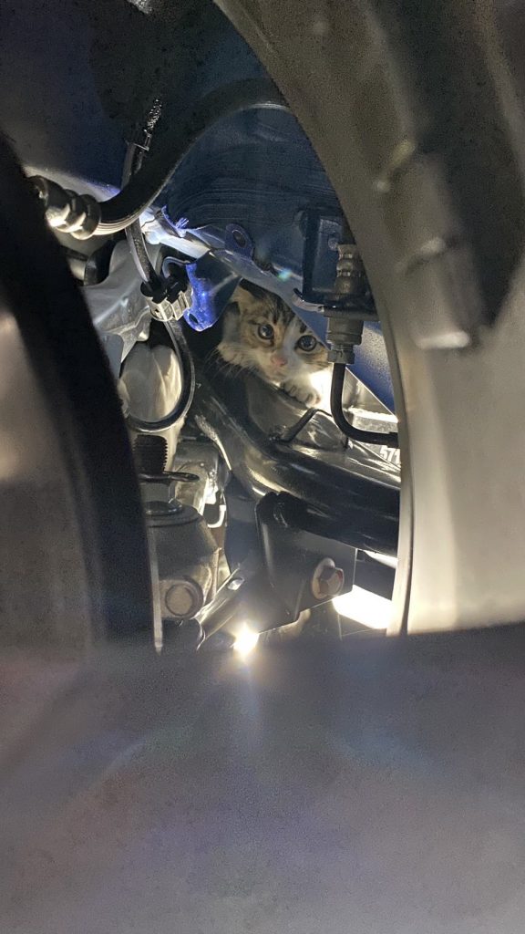 「お預かり中のお車の下からネコの鳴き声が聞こえる」とインカムが・・・。