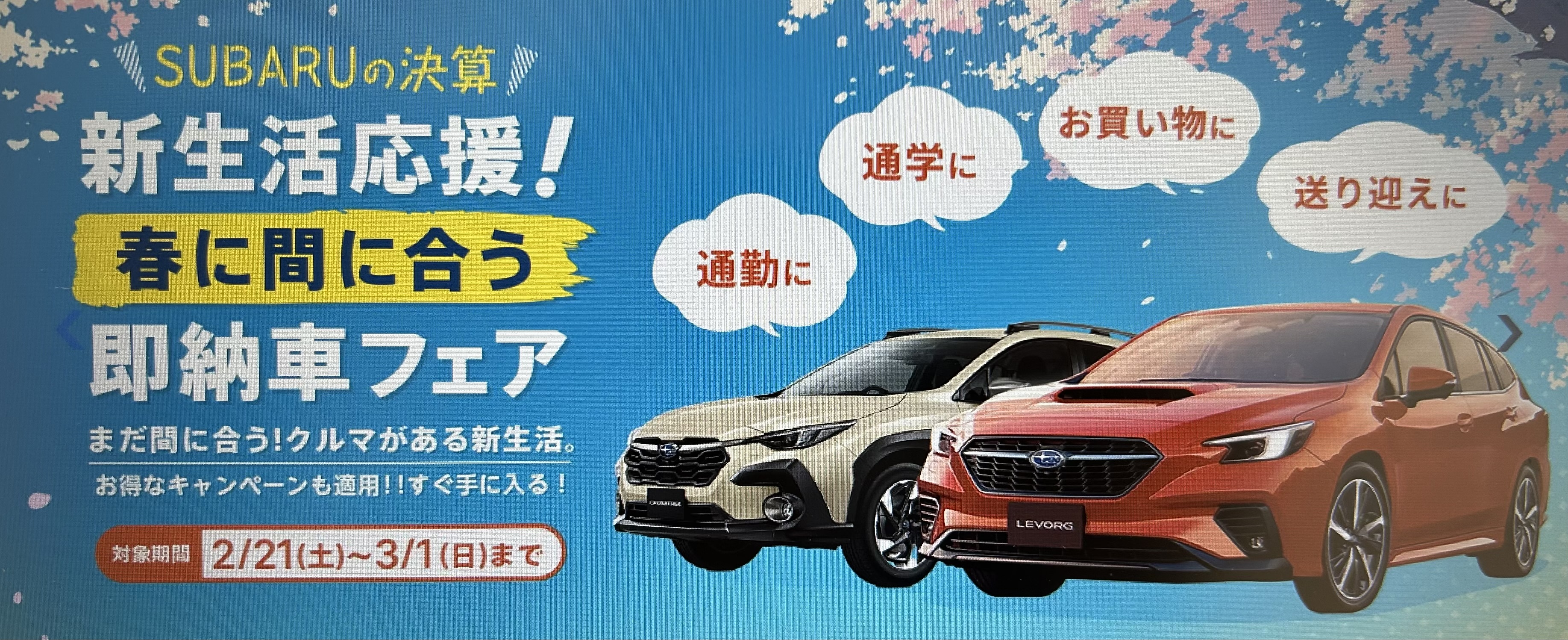 SUBARUの決算「新生活応援!春に間に合う即納車フェア」3月1日まで![]()